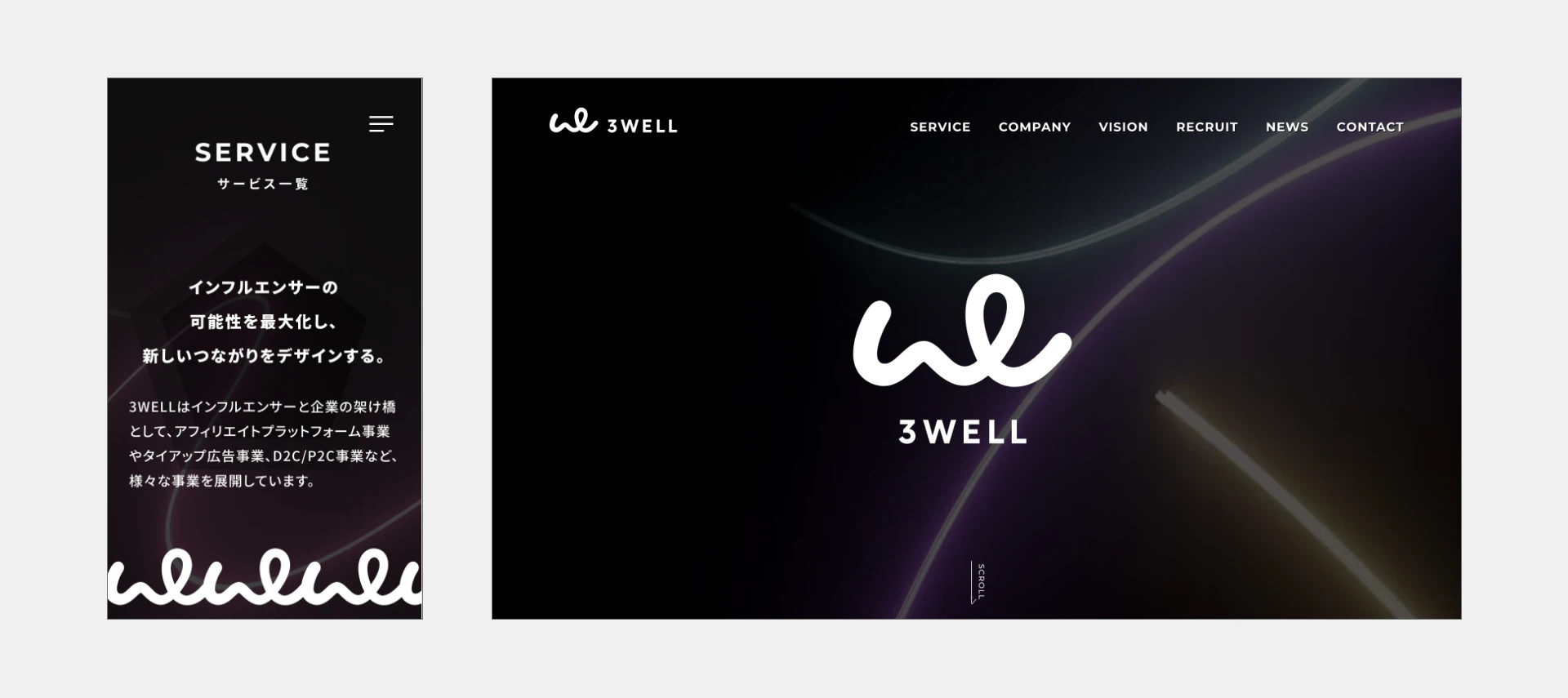 デザイン面では、3WELLらしい前向きさやエネルギーを表現しつつ、企業サイトとしての信頼感と読みやすさのバランスを意識。あわせて、人と人、企業とインフルエンサーの「つながり」を視覚的に表現した、ライトアート風のアニメーション演出も取り入れています。